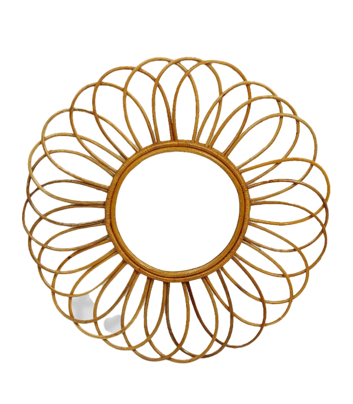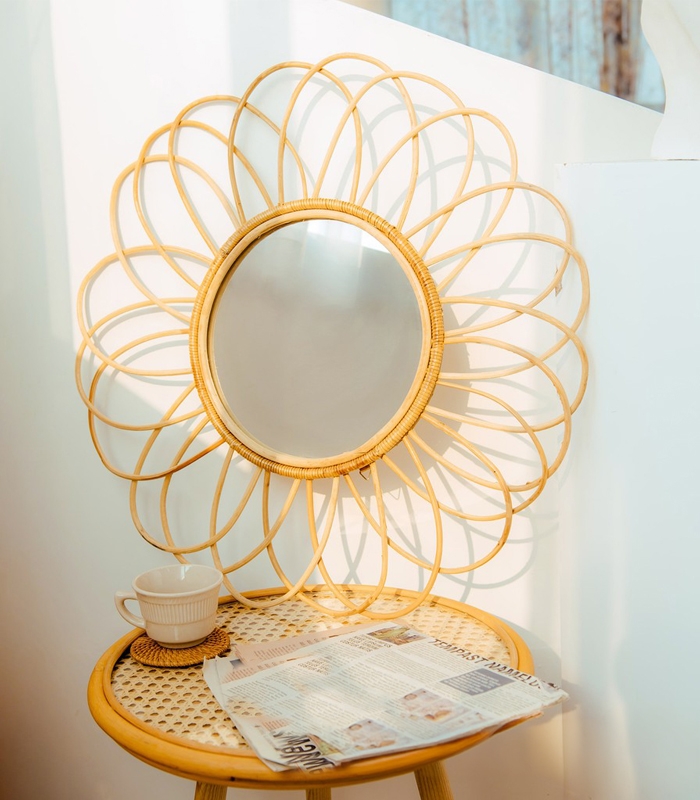 Khung gương được đan tỉ mỉ từng sợi mây, tạo hiệu ứng tỏa tròn tựa ánh mặt trời, khiến căn phòng thêm phần sinh động và sáng bừng sức sống.